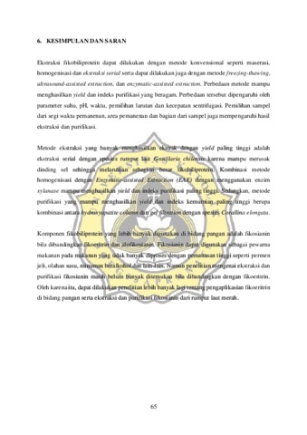 Rumput laut memiliki spesies melimpah yang dimanfaatkan untuk bahan pangan dan bahan olahan pangan (alginat, karagenan, agar, pigmen), kesehatan (memiliki aktivitas antivirus, antioksidan, anti-inflamasi), pertanian, bahan kertas, kosmetik dan juga bahan bakar. Salah satu kandungan yang biasa dimanfaatkan adalah pigmen fikobiliprotein. Fikobiliprotein merupakan protein yang mampu berpendar (fluorescent) yang berperan sebagai pigmen utama dalam rumput laut merah. Ekstraksi fikobiliprotein dilakukan dengan dua tahap utama yaitu tahap pemisahan fikobiliprotein dari sel dan tahap isolasi. Pemisahan fikobiliprotein dilakukan dengan penghancuran sel dan menghasilkan ekstrak kasar. Kemudian, pada tahap isolasi atau purifikasi terjadi pemisahan komponen fikobiliprotein sehingga memiliki indeks kemurnian yang lebih tinggi. Metode ekstraksi konvensional memiliki beberapa keterbatasan, di antaranya adalah penggunaan pelarut yang terlalu banyak dan mungkin berbahaya bagi lingkungan serta waktu ekstraksi yang cenderung lama. Metode alternatif memiliki keunggulan berupa penggunaan pelarut cenderung lebih sedikit, waktu ekstraksi yang singkat serta yield lebih maksimal. Pemilihan metode ekstraksi harus didasarkan pada sifat senyawa yang diekstraksi sehingga perlu memperhatikan parameter-parameter yang mempengaruhi ekstraksi untuk memperoleh hasil ekstraksi yang maksimal. Tujuan dari penelitian ini adalah mengulas berbagai metode ekstraksi dan purifikasi serta faktor-faktor yang mempengaruhi yield fikobiliprotein pada rumput laut merah dan menganalisis parameter optimal dalam proses ekstraksi dan purifikasi agar didapatkan fikobiliprotein yang maksimal. Pada studi literatur ini, metode ekstraksi konvensional yang biasa dilakukan berupa metode maserasi, ekstraksi serial, homogenisasi dan freezing-thawing. Sedangkan metode alternatif yang digunakan adalah ultrasound assisted extraction (UAE) dan enzymatic assisted extraction (EAE). Metode yang banyak menghasilkan ekstrak dengan yield paling tinggi adalah ekstraksi serial karena mampu merusak dinding sel sehingga melarutkan sebagian besar fikobiliprotein. Sementara, metode alternatif yang banyak digunakan adalah EAE dengan menggunakan enzim xylanase. Metode purifikasi yang mampu menghasilkan fikoeritrin denganindeks kemurnian paling tinggi berupa kombinasi antara hydroxyapatite column dan gel filtration. Perbedaan metode ekstraksi terbukti mampu menghasilkan yield dan indeks purifikasi yang beragam. Perbedaan tersebut dipengaruhi oleh parameter suhu, pH, waktu, pemilihan larutan, dan kecepatan sentrifugasi. Pemilihan sampel dari segi waktu pemanenan, area pemanenan dan bagian dari sampel juga mempengaruhi hasil ekstraksi dan purifikasi.