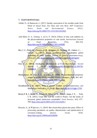 Mi merupakan sudah menjadi salah satu makanan pokok di beberapa negara. Namun, keberadaan gluten pada mi terigu menyebabkan para penderita celiac disease tidak dapat mengonsumsinya. Pembentukan struktur pada mi bebas gluten berbeda dengan mi terigu yang mengandung gluten. Umbi-umbian dapat digunakan sebagai bahan baku mi bebas gluten karena sebagian besar karbohidrat didalamnya adalah pati. Oleh karena itu, pengulasan ini dilakukan dengan tujuan untuk mengetahui pengaruh bahan baku, metode pengolahan, dan penambahan bahan tambahan pangan terhadap kualitas mi bebas gluten. Pengulasan ini dilakukan dengan diawali analisis kesenjangan, lalu dilanjutkan dengan pengumpulan literatur, penyaringan literatur, dan diakhiri dengan analisis serta tabulasi data dari literatur yang didapatkan. Dari pengulasan ini diketahui bahwa ukuran granula pati yang besar dapat menunjukkan tingginya kadar amilosa pada bahan yang digunakan. Kadar amilosa yang tinggi dapat meningkatkan kualitas mi, dimana hardness, cohesiveness, dan chewiness akan meningkat, serta cooking loss mi bebas gluten lebih rendah. Selain itu, berdasarkan ulasan ini, metode yang dapat menghasilkan mi bebas gluten dengan kualitas paling baik adalah dengan menggunakan teknologi cold–extrusion. Penambahan bahan tambahan pangan (BTP) seperti curdlan, glycerol monostearate, atau xanthan gum dapat dilakukan untuk meningkatkan kualitas tekstur mi, dan penambahan whey protein concentrate untuk meningkatkan kadar protein pada mi. Namun, penelitian pengolahan mi bebas gluten dengan menggunakan teknologi hot-extrusion serta pengaruh penambahan BTP lainnya seperti locust bean gum, konjac glucomannan, dan hydroxypropyl methylcellulose pada mi bebas gluten masih belum banyak ditemukan. Oleh karena itu, dapat dilakukan penelitian yang lebih banyak lagi tentang pengaplikasian teknologi hot–extrusion dan penambahan BTP pada pengolahan mi bebas gluten.