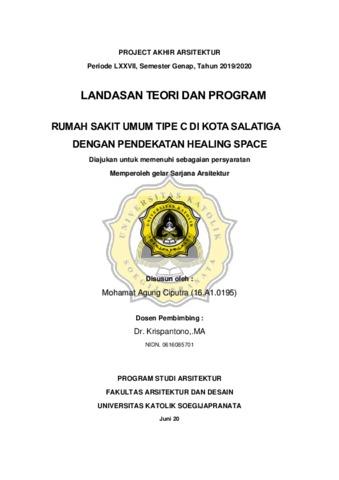 Ciputra, Mohamat Agung (2020) RUMAH SAKIT UMUM TIPE C DI KOTA SALATIGA DENGAN PENDEKATAN HEALING SPACE. Other thesis, Universitas Katolik Soegijapranata Semarang.