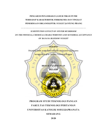 KURNIAWAN, HENGKY (2020) PENGARUH PENAMBAHAN JAMUR TIRAM PUTIH TERHADAP KARAKTERISTIK FISIKOKIMIA DAN TINGKAT PENERIMAAN ORGANOLEPTIK NUGGET JANTUNG PISANG. Other thesis, UNIKA SOEGIJAPRANATA SEMARANG.
