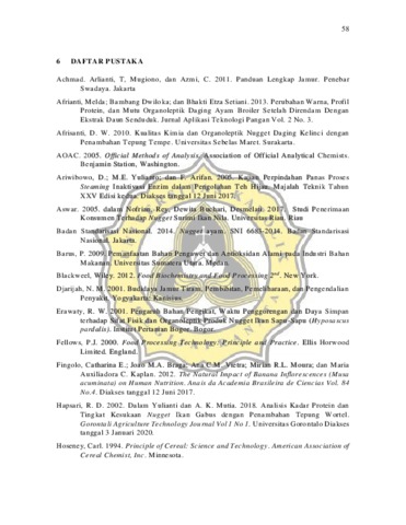 Jantung pisang merupakan bagian dari tanaman pisang yang seringka li menjadi limbah. Jantung pisang dapat diolah menjadi produk pangan menyerupa i daging yang mem iliki nilai jual yang tinggi. Salah satu contoh produk olahan dari jantung pisang adalah nugge t. Pembuatan nugget jantung pisang diduga kua t akan mem ilik i tekstur yang jauh berbeda dengan nugget daging pada umumnya, serta mem iliki aroma yang kurang enak. Penambahan jamur tiram putih pada penelitian ini bertujuan untuk meningkatkan kualitas tekstur dan penampakan bagian dalam pada nugget jantung pisang. Penelitian ini bertujuan untuk mengetahui pengaruh dari perbedaan konsentrasi jamur tiram putih dan pemberian garam terhadap karakteristik fisik dan kim iaw i nugge t jantung pisang serta mengetahui tingkat penerimaan nugget jantung pisang oleh konsumen. Pada tahap awal dilakukan pengukuran kadar air, antioksidan, protein, lemak, serat kasar dan uji warna pada jantung pisang kukus. Penelitian dilanjutkan dengan pembuatan nugget jantung pisang berdasarkan dua perlakuan jantung pisang (jantung pisang tanpa perlakuan dan diberi perlakuan perendaman garam 10 %) dan tiga konsentrasi jamur tiram putih (0 %, 30 %, dan 50 %). Keenam nugge t jantung pisang itu kemudian diuji tekstur, warna, kadar air, aktivitas antioksidan, protein, lemak, serat kasar dan kemudian uji tingkat kesukaan oleh panelis. Dari hasil pengujian tekstur, nugge t yang menggunakan jantung pisang dengan perendaman garam 10 % mem iliki sifat lebih keras daripada nugget yang menggunakan jantung pisang tanpa perendaman garam, penambahan jamur tiram putih ternyata juga tidak mempengaruhi tekstur nugge t jantung pisang. Warna pada nugget jantung pisang yang dihasilkan adalah abu-abu kecokla tan hingga abu-abu. Semakin banyak konsentrasi jamur tiram putih yang digunakan membuat warna nugge t menjadi lebih terang. Hasil pengujian menunjukkan nugget jantung pisang yang dihasilkan mengandung kadar air antara 40,01 % hingga 41,79 % yang sesuai dengan standar SNI nugge t daging ayam. Namun untuk kadar protein yang dihasilkan tidak sesua i dengan standar yaitu sebesar 6,49 % hingga 7,51 %. Kadar lemak yang dihasilkan juga tidak sesuai dengan standar yang ada yaitu sebesar 19,69 % hingga 22,02 %. Nugget jantung pisang yang dihasilkan mem iliki nila i aktivitas antioksidan yang cukup tinggi yaitu sebesar 21,71 % hingga 27,10 %. Serat pangan pada nugget jantung pisang berkisar antara 3,23 % hingga 5,93 %, lebih tinggi daripada nugget daging ayam yang hanya mem iliki kadar serat sebesar 0,9 %.