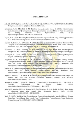 Umbi porang (Amorphophallus muelleri, Blume) berpotensi memiliki nilai ekonomis yang tinggi, karena mengandung glukomannan yang cukup tinggi. Glukomannan merupakan serat pangan larut air yang bersifat hidrokoloid kuat dan rendah kalori sehingga berpotensi untuk dikembangkan pada bidang industri baik industri pangan atau non pangan juga bidang kesehatan. Masalah utama dalam pengembangan tepung glukomannan adalah adanya komponen lain seperti kalsium oksalat yang cukup tinggi, protein, pati, lemak yang menyebabkan kualitas glukomannan dalam tepung menurun. Tujuan penelitian ini adalah menentukan kondisi optimum dari isolasi glukomannan langsung dari umbi porang segar dengan metode penggilingan dalam pelarut isopropanol (IPA) dan arak untuk menghasilkan tepung glukomannan dengan kemurnian tinggi dan proses pengeringan menggunakan Solar Tunnel Dryer (STD). Dalam penelitian ini, optimasi dilakukan dengan isolasi glukomannan yakni sampel berulangkali digiling dalam pelarut (alkohol) dan kemudian disaring tanpa proses pemurnian selanjutnya. Variabel bebas dalam penelitian ini adalah konsentrasi pelarut dan jumlah penggilingan. Pelarut yang digunakan adalah isopropanol 50 %, 70 % dan 90 % serta arak (44 % mengandung alkohol sebagai hasil penyulingan tradisional dari nira aren) dengan jumlah penggilingan sebanyak 3 kali, 5 kali dan 7 kali serta proses pengeringan menggunakan Solar Tunnel Dryer (STD). Kondisi optimum dari proses isolasi glukomannan adalah pada perlakuan lima kali penggilingan menggunakan pelarut IPA 90 % dengan kandungan glukomannan tertinggi yakni 90,29 % serta kadar kalsium oksalat 763,02 mg/100g (0.76%), tingkat kecerahan 84,14 %, kadar air 6,63%, kadar abu 1,58 %, kadar protein terendah 2,27 % serta rendemen 32,62 %. Sedangkan dengan pelarut arak (44 % alkohol), kondisi optimumnya diperoleh pada perlakuan lima kali penggilingan dengan menghasilkan 81,82 % glukomannan serta kadar kalsium oksalat, intensitas warna, kadar air, kadar abu, kadar protein, dan rendemen berturut turut 714,89 mg/100g (0,71%), 80,81%, 7,46 %, 2,35% serta 35,14 %. Kadar glukomannan perlakuan terbaik 90,29 % lebih rendah nilainya dibandingkan dengan tepung glukomannan komersial yakni 92,51%.