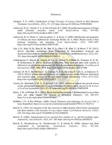 Hydrothermal treatment is a physical modification process which uses temperature and moisture to modify starch properties. Heat moisture treatment (HMT) is one of the hydrothermal modification which causes some changes on starch properties such as pasting, swelling power, solubility and thermal properties. HMT was carried out by adjusting moisture content of tapioca (Manihot esculenta), potato (Solanum tuberosum) and sweet potato (Ipomoea batatas) starches to 15 and 30% and heating at 90-110°C for 3 - 9 hours. The objective of this study was to investigate the effect of hydrothermal treatment on physical properties of tuber starches. In general, most of starches were decreased on peak viscosity and breakdown and increased on pasting temperature. The gelatinization temperatures, namely onset (To ), peak (Tp ), and conclusion (Tc ) of HMT starches were higher than native starches. 30% moisture content gave significant difference on enthalpy (ΔH) reduction. Swelling power and solubility of HMT starches were decreased except for HMTtapioca starch which had higher solubility on 90°C compared to native. Adjusting 30% moisture content of starches showed some significant changes on starch swelling power, solubility, pasting and thermal properties. Increasing temperature and heating duration could increase starch final viscosity, pasting temperature and gelatinization temperature, thus decreasing peak viscosity, enthalpy (ΔH), swelling power, and solubility.