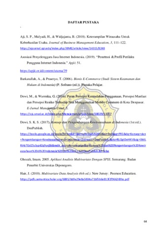Penelitian ini bertujuan untuk mengetahui dan menganalisis bagaimana pengaruh e-commerce yang terdiri dari kemudahan e-commerce, kegunaan e-commerce, kepercayaan dan norma subjektif terhadap minat berwirausaha. Dan diharapkan hasil dari penelitian ini dapat memberikan gambaran terhadap mahasiswa Unika Soegijapranata untuk memanfaatkan e-commerce sebagai sarana untuk menjualkan produk. Data yang digunakan dalam penelitian ini adalah data primer yang dikumpulkan dari penyebaran kuesioner dengan snow-ball sampling dan quota sampling. Sampel dalam penelitian ini terdapat 130 responden yang mengambil mata kuliah pengantar kewirausahaan atau kewirausahaan. Penelitian ini menggunakan metode analisis regresi liniear berganda. Hasil penelitian ini menunjukkan kemudahan e-commerce tidak berpengaruh signifikansi terhadap minat berwirausaha sedangkan ketiga variabel lainnya kegunaan e-commerce, kepercayaan dan norma subjektif memiliki pengaruh signifikansi terhadap minat berwirausaha. Kemudian secara simultan kemudahan e-commerce, kegunaan e-commerce, kepercayaan dan norma subjektif memiliki pengaruh signifikansi terhadap minat berwirausaha
