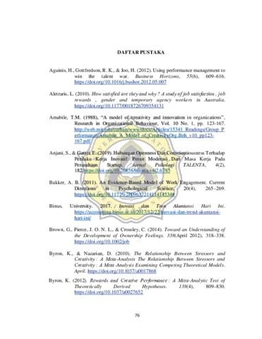 Revolusi industri menunjukan kemajuan tekonologi yang berkembang pesat sekaligus menimbulkan persaingan bisnis sehingga inovasi dari sumber daya manusia merupakan salah satu unsur terpenting dalam kemajuan perusahaan terlebih pada perusahaan startup. Perilaku kerja inovatif dari karyawan inilah yang dibutuhkan bagi perusahaan startup untuk mampu bersaing dengan perusahaan lain. Penghargaan intrinsik diakui sebagai alat yang mampu mendorong terciptanya perilaku inovatif. Penelitian ini ingin menguji dan mencari bukti, yang pertama, apakah terdapat perbedaan interaksi perilaku kerja inovatif yang dihasilkan saat individu diberi maupun tidak diberi penghargaan intrinsik pada kondisi kompleksitas pekerjaan yang tinggi dan rendah. Kedua, apakah terdapat perbedaan interaksi saat kepribadian conscientiousness diberi dan tidak diberi penghargaan intrinsik terhadap perilaku kerja inovatif yang dihasilkan. Objek dalam penelitian ini merupakan mahasiswa S1 Program Studi Akuntansi Universitas Katolik Soegijapranata Semarang yang telah menempuh mata kuliah Teori Organisasi. Teknik pengumpulan data menggunakan metode eksperimen dengan jumlah partisipan sebanyak 90 mahasiswa. Penelitian ini berkontribusi dalam mengembangkan literatur akuntansi manajemen terkhusus pada akuntansi keperilakuan. Hasil dari penelitian menunjukan bahwa: (1) Individu yang dihadapkan kompleksitas pekerjaan tinggi dan diberi penghargaan intrinsik tidak menghasilkan perilaku kerja inovatif lebih tinggi dibandingkan yang tidak diberi penghargaan intrinsik (2) Individu yang dihadapkan kompleksitas pekerjaan rendah dan diberi penghargaan intrinsik maka perilaku kerja inovatif yang dihasilkan lebih tinggi dibandingkan yang tidak diberi penghargaan intrinsik (3) Pengaruh conscientiousness terhadap perilaku kerja inovatif tidak berbeda antara yang diberi penghargaan intrinsik dan tidak diberi penghargaan intrinsik