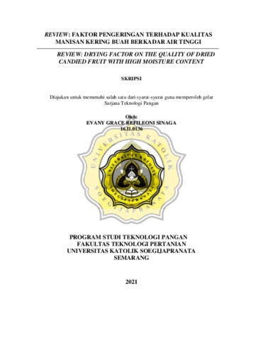 SINAGA, EVANY GRACE REFILEONI (2021) REVIEW: FAKTOR PENGERINGAN TERHADAP KUALITAS MANISAN KERING BUAH BERKADAR AIR TINGGI. Other thesis, Universitas Katholik Soegijapranata Semarang.