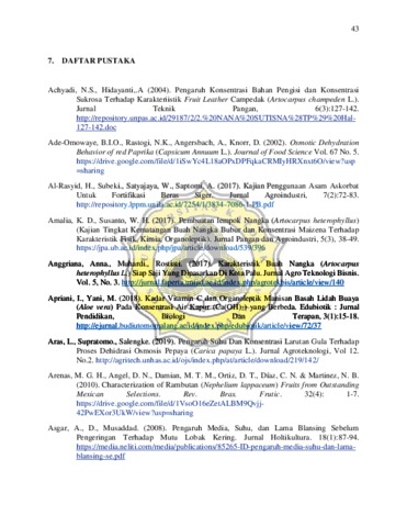 Indonesia merupakan negara beriklim tropis menghasilkan buah-buahan segar yang berlimbah. Setiap tahun produksi buah segar di Indonesia terus meningkat, salah satu faktornya adalah peningkatan kesadaran masyarakat atas pentingnya konsumsi buah. Buah memiliki kandungan gizi yang baik seperti serat, vitamin, dan antioksidan. Buah segar juga memiliki kandungan air yang tinggi, hal ini menyebabkan buah mudah rusak akibat adanya pertumbuhan mikroorganisme pembusuk. Kerusakan pada buah menyebabkan buah kehilangan manfaatnya sehingga harus dibuang dan menjadi limbah. Pengolahan buah menjadi manisan kering merupakan salah satu metode pengawetan buah yang dapat memperpanjang umur simpan dan memaksimalkan manfaat dari buah-buahan tersebut. Pengolahan buah menjadi manisan kering merupakan metode yang murah dan mudah dilakukan. Pengolahan manisan diawali dengan perendaman buah dalam larutan kapur sirih (Ca(OH)2), perendaman buah dalam larutan gula pekat, dan dikeringkan pada suhu dan waktu tertentu. Faktor pengeringan merupakan faktor yang dapat mempengaruhi kualitas fisikokimia akhir dari produk manisan kering yang dihasilkan, seperti kadar air, kandungan vitamin C, total gula, serta tekstur manisan kering. Pengeringan merupakan salah satu metode pengawetan tertua yang dilakukan dengan menguapkan sebagian besar kandungan air dalam suatu bahan pangan agar tidak tersedia lagi untuk pertumbuhan mikroorganisme. Kajian ini membahas tentang pengaruh pengeringan dengan suhu dan waktu yang optimum, serta pengaruh antara pengeringan dengan perlakuan perendaman buah dalam larutan kapur (Ca(OH)2) dan larutan gula pekat terhadap kualitas fisikokimia produk manisan kering buah. Berdasarkan studi literatur dapat disimpulkan bahwa faktor pengeringan berpengaruh terhadap kualitas fisikokimia produk manisan kering buah, berupa penurunan kadar air, penurunan kandungan vitamin C, peningkatan total gula, serta peningkatan hardness manisan kering. Studi lanjut berupa percobaan eksperimental perlu dilakukan untuk memperoleh hasil penelitian yang akurat