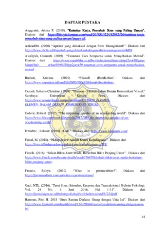 Stres menjadi salah satu permasalahan dalam kehidupan perkotaan, khususnya pada pekerja. Stres kerja diakibatkan oleh rutinitas kerja, beban kerja dan tekanan dari atasan. Para pekerja khususnya usia dewasa muda, belum memiliki pengalaman stres dibandingkan pekerja usia tua. Pengendalian stres diperlukan oleh pekerja muda untuk menjaga kesehatan psikis dan fisik, salah satunya melalui berkebun. Berkebun dapat menjadi terapi stres bagi pekerja muda karena efektif menurunkan kadar hormon kortisol atau hormon stres. Terapi tersebut melalui stimulus yang diberikan oleh tanaman terhadap panca indera manusia, seperti indera penglihata, penciuman dan peraba. Informasi mengenai terapi dengan berkebun belum banyak diketahui oleh masyarakat Indonesia khususnya didaerah perkotaan dengan tingkat stres yang tinggi. Lalu belum ada panduan instruksional mengenai terapi dengan berkebun melalui stimulus yang diberikan oleh tanaman. Perancangan ini menjadi sarana informasi dan instruksi panduan terapi dengan berkebun sebagai manajemen stres bagi pekerja muda di perkotaan, yang efektif dalam mengatasi permasalahan stres kerja melalui media aplikasi yang dapat diakses kapanpun dan dimanapun. Kata kunci: Manajemen Stres, Pekerja Muda, Terapi, Berkebun, Desain Visual Aplikasi. Stress become one of the problem roots in modern lifestyle. Stress can be caused from work routine, workload, and pressure from boss or work peers. The young salaryman especially, have less stress experience than the old one. Stress management is needed by young worker to keep their body and mind healthy, one of the solution is by gardening. Gardening can be therapy exercise to maintain the stress for lower cortisol hormon or stress hormonal. The therapy is through stimuli provided by plants to the five human senses, such as the senses of sight, smell and touch. Information about therapy with gardening is not widely known by Indonesians, especially in urban areas with high stress levels. Then there is no instructional guide regarding therapy with gardening through the stimulus provided by plants. This design is a means of information and instruction guide therapy with gardening as stress management for young urban workers, which is effective in overcoming work stress problems through application media that can be accessed anytime and anywhere.