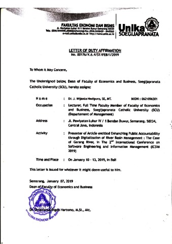 Hadipuro, Wijanto (2019) ENHANCING PUBLIC ACCOUNTABILITY THROUGH DIGITALIZATION OF RIVER BASIN MANAGEMENT: THE CASE OF GARANG RIVER. In: ICSIM 2019, 10-13 Januar1 2019, Undiksha Singaraja Bali.