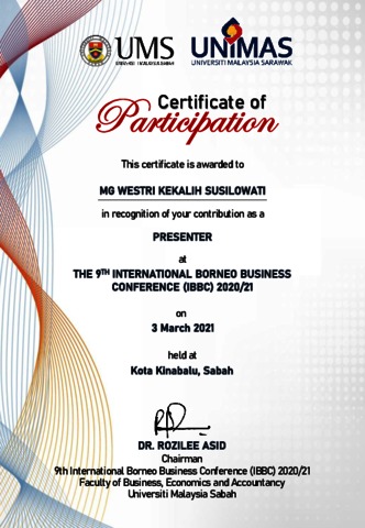 SUSILOWATI, MG. WESTRI KEKALIH and Wahyuningdyah, Retno Yustini and Kurniasari, Widuri (2021) DEVELOPING THE STRATEGY OF ECOTOURISM DEVELOPMENT BASED ON REGIONAL PLANNING ANALYSIS: THE STUDY OF KABALONG ECOTOURISM, PEKALONGAN REGENCY INDONESIA. In: The 9th International Borneo Business Conference, 3-5 Maret 2021, VIRTUAL CONFERENCE (Kinabalu, Sabah, Borneo).