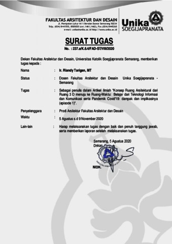 UNSPECIFIED (2021) Konsep Ruang Arsitektural dari Ruang 3 D menuju ke Ruang-Waktu: Belajar dari Teknologi Informasi dan Komunikasi serta Pandemik Covid'19: Dampak dan Implikasinya (episode 1). In: Refleksi Keilmuan Dosen Arsitektur Unika Soegijapranata “Dies Natalis Program Studi Arsitektur Unika Soegijapranata ke-53”, Senin, 9 November 2020, Semarang.