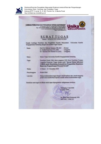 prof. Dr. Ridwan Sanjaya, MS.IEC, ridwan and Dr. Theresia Dwi Hastuti, MSi, there and G. Freddy Koeswoyo,SE., M.Si, freddy (2020) inovasi sistem informasi UMKM untuk mendukung kemandirian pengambilan keputusan bisnis dan pengembangan ekonomi kreatif. -. (Unpublished)