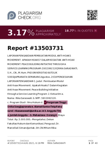 SARASWATI, RIKA PEMBUATAN MODUL ANTI-HOAKS MOVEMENT: “APAKAH HOAKS?” DALAM KEGIATAN “ANTI-HOAX MOVEMENT: PEACE BULIDING INITIATIVE THROUGH A SERVICE LEARNING PROGRAM”. Project Report. Unika Soegijapranata Semarang, Semarang. (Submitted)