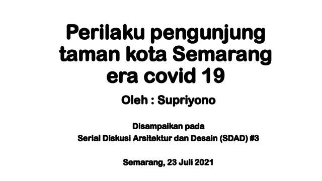 Supriyono, . (2021) Perilaku Pengunjung Taman Kota Semarang era covid-19. In: SERIAL DISKUSI ARSITEKTUR DAN DESAIN, 23 Juli 2021, Soegijapranata Catholic University. (Submitted)