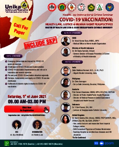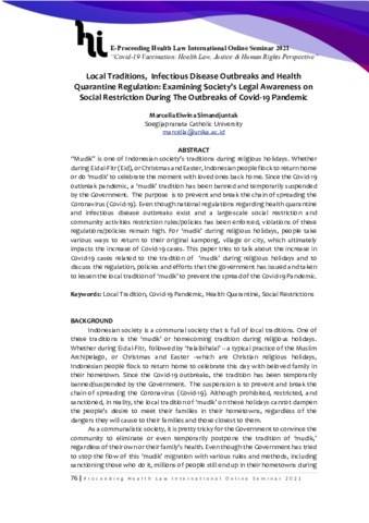 Simandjuntak, Marcella Elwina (2021) Local Traditions, Infectious Disease Outbreaks & Health Quarantine Regulation: Examining Society’s Legal Awareness on Social Restriction During The Outbreaks of Covid-19 Pandemic, presented in Health Law International Online Seminar under the Theme: Covid-19 Vaccination: Health Law, Justice and Human Rights Perspectives, June 5th, 2021. In: Health Law International Online Seminar: Covid-19 Vaccination: Health Law, Justice and Human Rights Perspectives, June, 5, 2021, Semarang, Indonesia via Zoom Meeting.