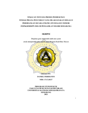 FERDIANTO, DANIEL (2021) TINJAUAN TENTANG PROSES PEMBUKTIAN TINDAK PIDANA PENCURIAN YANG DILAKSANAKAN MELALUI PERSIDANGAN SECARA ONLINE (STUDI KASUS NOMOR 192/Pid.B/2020/PN SMG DI PENGADILAN NEGERI SEMARANG). Other thesis, Universitas Katholik Soegijapranata Semarang.