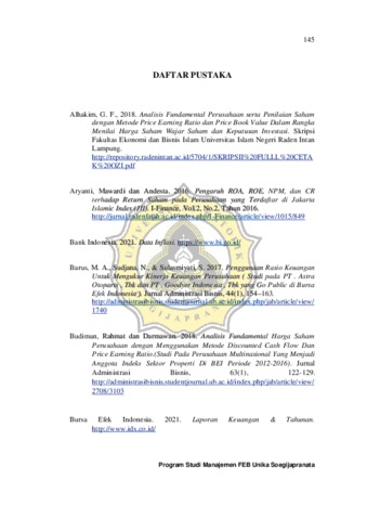 LISHERA, NURMA (2021) ANALISIS RASIO KEUANGAN DAN RETURN SAHAM SEBAGAI DASAR PENGAMBILAN KEPUTUSAN INVESTASI SAHAM PADA PERUSAHAAN SUB SEKTOR TRANSPORTASI LAUT YANG TERDAFTAR DI BEI TAHUN 2015-2018. Other thesis, Universitas Katholik Soegijapranata Semarang.