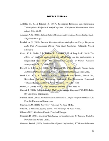 RADEVA, ZABRINA NAU’FAL DHEA (2021) PENGARUH SELF LEADERSHIP, SELF EFFICACY, DAN KECERDASAN EMOSIONAL TERHADAP KINERJA KARYAWAN DI BANK MANDIRI KCP PURI ANJASMORO SEMARANG. Other thesis, Universitas Katholik Soegijapranata Semarang.