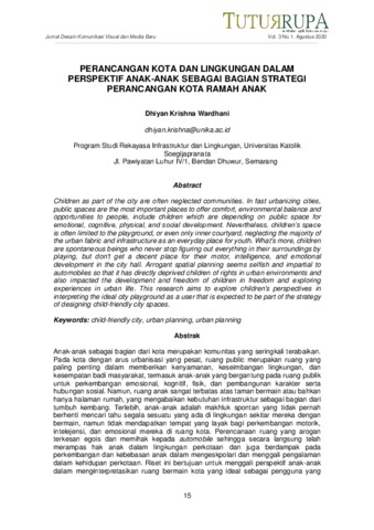 Anak-anak sebagai bagian dari kota merupakan komunitas yang seringkali terabaikan. Pada kota dengan arus urbanisasi yang pesat, ruang public merupakan ruang yang paling penting dalam memberikan kenyamanan, keseimbangan lingkungan, dan kesempatan badi masyarakat, termasuk anak-anak yang bergantung pada ruang publik untuk perkembangan emosional, kognitif, fisik, dan pembangunan karakter serta hubungan sosial. Namun, ruang anak sangat terbatas atas taman bermain atau bahkan hanya halaman rumah, yang mengabaikan kebutuhan infrastruktur sebagai bagian dari tumbuh kembang. Terlebih, anak-anak adalah makhluk spontan yang tidak pernah berhenti mencari tahu segala sesuatu yang ada di lingkungan sekitar mereka dengan bermain, namun tidak mendapatkan tempat yang layak bagi perkembangan motorik, intelejensi, dan emosional mereka di ruang kota. Perencanaan ruang yang arogan terkesan egois dan memihak kepada automobile sehingga secara langsung telah merampas hak anak dalam lingkungan perkotaan dan juga berdampak pada perkembangan dan kebebasan anak dalam mengeskpolari dan menggali pengalaman dalam kehidupan perkotaan. Riset ini bertujuan untuk menggali perspektif anak-anak dalam menginterpretasikan ruang bermain kota yang ideal sebagai pengguna yang diharapkan dapat menjadi bagian dari strategi perancangan ruang kota yang ramah anak. Kata Kunci: kota ramah anak, perencanaan kota, perancangan kota