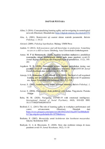 Penelitian ini bertujuan untuk mengetahui hubungan self-awareness dan the big five personality traits dengan learning agility pada mahasiswa dalam online learning. Terdapat dua hipotesis utama dalam penelitian ini, yaitu : 1) Terdapat hubungan positif antara self-awareness dengan learning agility pada mahasiswa dalam online learning, 2) Terdapat hubungan positif antara masing-masing traits the big five personality traits (openness to experience, extraversion, conscientiousness, dan agreeableness) dengan learning agility pada mahasiswa dalam online learning, 3) Terdapat hubungan negatif neuroticism dengan learning agility pada mahasiswa dalam online learning. Partisipan penelitian ini adalah mahasiswa S1 Fakultas Psikologi Undip menggunakan teknik sampling insidental dengan jumlah sampel 225 mahasiswa. Data penelitian diambil menggunakan skala learning agility, skala self-awareness dan skala the big five personality traits. Hasil penelitian menunjukkan adanya hubungan positif yang signifikan antara self-awareness dengan learning agility pada mahasiswa dalam online learning (p<0,01). Hasil penelitian selanjutnya yaitu terdapat hubungan positif yang sangat signifikan masing-masing traits the big five personality traits yaitu openness to experience, extraversion, conscientiousness, dan agreeableness dengan learning agility pada mahasiswa dalam online learning (p<0,01). Serta terdapat hubungan negatif yang sangat signifikan antara neuroticism dengan learning agility (p<0,01). Dari hasil tersebut dapat disimpulkan bahwa hipotesis dalam penelitian ini diterima
