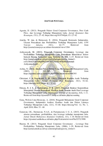 Pertumbuhan ekonomi yang pesat menyebabkan persaingan yang ketat. Perusahaan bersaing untuk mendapatkan kucuran dana dari investor untuk kelangsungan hidup perusahaan kedepannya. Informasi laba digunakan manajer untuk menarik investor agar mau menanamkan modalnya di perusahaan. Asimetri informasi menyebabkan adanya ketidakseimbangan dalam memperoleh informasi suatu perusahaan antara pihak manajemen dan pemegang saham. Manajemen akan memiliki informasi yang lebih dibanding dengan pihak eksternal. Pada penelitian ini leverage diproksikan dengan Debt to Asset Ratio, profitabilitas diproksikan dengan Retrun On Asset (ROA), dan ukuran perusahaan diproksikan dengan Ln total aset. Penelitian ini menggunakan data perusahaan manufaktur di Bursa Efek Indonesia periode 2012-2017 dan modified jones model untuk menghitung discretionary accrual sebagai ukuran manajemen laba. Hasil dari penelitian ini menunjukkan bahwa leverage berpengaruh signifikan terhadap manajemen laba. Profitabilitas berpengaruh sinifikan terhadap manajemen laba. Ukuran perusahaan tidak berpengaruh terhadap manajemen laba