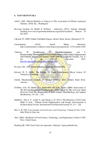 Permen jelly adalah salah satu produk confectionery yang bersifat kenyal atau elastic terbuat darisari buah dan bahan pembentul gel yang banyak disukai oleh anak anak ataupun masyarakat pada umumnya. Salah satu bahan pembentuk gel yang sering digunakan dalam pembuatan permen jelly adalah gelatin. Gelatin pada umumnya diproduksi dari kulit atau tulang sapi yang bersifat gelling agent sehingga memiliki kekenyalan yang khas dan digunakan sebagai bahan pembentuk gel dalam produksi permen jelly. Daun cincau hijau (Cyclea barbata Miers ) merupakan tanaman lokal yang mudah dibudidayakan di Indonesia dan memiliki sifat fungsional yang dapat bermanfaat bagi tubuh kita. Daun cincau hijau mengandung senyawa polisakarida hidrokoloid yang berperan dalam kemampuan pembentukan gel. Senyawa polisakarida hidrokoloid yang terkandung pada daun cincau hijau (Cyclea barbata Miers ) adalah pektin yang bermetoksi rendah. Kandungan senyawa polisakarida dalam daun cincau hijau dapat menjadi alternative subtitusi gelatin pada produk permen jelly. Tujuan dilakukannya penelitian ini adalah untuk mengetahui karakteristik permen jelly dengan penambahan sari cincau hijau ditinjau dari sifat fisikokimia dan organoleptik. Pada penelitian ini, pembuatan permen jelly ditambahkan sari daun cincau hijau dan gelatin pada konsentrasi yang berbeda terhadap karakteristik fisikokimia produk permen jelly cincau hijau serta mengetahui tingkat penerimaan konsumen terhadap produk tersebut berdasarkan uji organoleptik. Analisa fisik yang digunakan yaitu kekerasan, kelengketan, kekenyalan serta warna. Analisa kimia yaitu kadar air, gula reduksi dan aktivitas air, serta uji sensori dengan uji rating hedonik. Berdasarkan penelitian dapat diketahui bahwa peningkatan konsentrasi gelatin dan daun cincau hijau akan meningkatkan nilai kadar air dan tidak berpengaruh secara nyata. Semakin tinggi penambahan gelatin dan sari daun cincau hijau akan meningkatkan kekerasan produk, serta menurunkan tingkat kelengketan dan kekenyalan. Peningkatan konsentrasi gelatin dan sari daun cincau hijau tidak berpengaruh secara nyata terhadap warna permen jelly. Semakin tinggi konsentrasi gelatin dan cincau hijau yang ditambahkan maka akan meningkatkan kadar gula reduksi dan intensitas air. Keseluruhan kadar air permen jelly cincau hijau memenuhi standar SNI yakni kurang dari 20%. Hasil uji rating hedonik pada produk permen jelly yang disukai oleh panelis tidak terlatih adalah dengan penambahan konsentrasi sari daun cincau hijau sebanyak 30% dan gelatin sebanyak 22%.