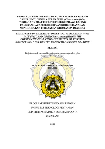 HAYUNINGADI, PRISCELLA CHRISANTY (2021) PENGARUH PENYIMPANAN BEKU DAN MARINASI GARAM DAPUR (NaCl) DENGAN JERUK NIPIS (Citrus Aurantifolia) TERHADAP KARAKTERISTIK FISIKOKIMIAWI DAGING PANGGANG AYAM BROILER YANG DIBUDIDAYAKAN MENGGUNAKAN PERLAKUAN KROMANON DEAMINA. Other thesis, Universitas Katholik Soegijapranata Semarang.