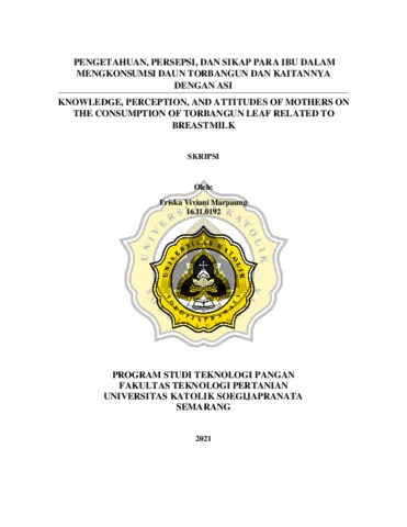 Marpaung, Friska Viviani (2021) PENGETAHUAN, PERSEPSI, DAN SIKAP PARA IBU DALAM MENGKONSUMSI DAUN TORBANGUN DAN KAITANNYA DENGAN ASI. KNOWLEDGE, PERCEPTION, AND ATTITUDES OF MOTHERS ON THE CONSUMPTION OF TORBANGUN LEAF RELATED TO BREASTMILK. Other thesis, Universitas Katholik Soegijapranata Semarang.