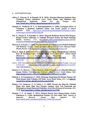 Air susu ibu adalah makanan terbaik untuk bayi yang baru lahir hingga umur 6 bulan. Salah satu cara untuk meningkatkan produksi ASI adalah dengan menggunakan laktagogum (lactagogue). Salah satu tanaman pangan yang memiliki fungsi sebagai laktagogum adalah tanaman torbangun atau daun bangun-bangun (Coleus amboinicus L). Torbangun biasa digunakan oleh masyarakat Batak untuk dikonsumsi dalam bentuk sop untuk meningkatkan produksi ASI. Tujuan penelitian ini untuk mengetahui keragaman pengetahuan, persepsi dan sikap serta hubungan antar aspek-aspek tersebut pada ibu-ibu yang sedang menyusui maupun yang pernah menyusui mengenai konsumsi daun torbangun dan kaitannya dengan ASI. Metode survei dilakukan dengan kriteria responden ibu-ibu yang sedang atau pernah menyusui dan ibu-ibu yang sedang atau pernah mengkonsumsi daun torbangun, berusia 21-40 tahun, dan bersedia mengisi kuesioner yang diberikan. Berdasarkan uji pendahuluan terhadap 25 responden, didapatkan jumlah responden yang harus menjadi sampel sebanyak 310 orang. Dari pengujian terhadap pertanyaan dalam kuesioner dengan menggunakan 50 responden, didapatkan 24 pertanyaan yang digunakan, dan disebarkan kepada 310 responden. Berdasarkan hasil penelitian yang diperoleh, usia terbanyak yang didapatkan dari penelitian ini adalah ibu yang berusia 21 – 25 tahun (26%). Dari hasil keragaman responden memiliki pengetahuan dan sikap yang baik, sedangkan responden memiliki persepsi yang kurang baik dalam mengkonsumsi daun torbangun untuk memperlancar ASI. Terdapat hubungan antara sikap mengkonsumsi daun torbangun terhadap pengetahuan dan persepsi. Sedangkan untuk sikap merekomendasikan kepada orang lain terhadap pengetahuan dan persepsi tidak berhubungan nyata. Kesimpulannya adalah responden telah memiliki pengetahuan dan sikap yang baik, namun memiliki persepsi yang kurang baik dalam hal mengkonsumsi daun torbangun dalam memperlancar ASI. Antara sikap dalam konsumsi daun torbangun terhadap pengetahuan dan persepsi diketahui adanya hubungan, sedangkan antara aspek sikap dalam menyarankan orang lain dalam mengkonsumsi daun torbangun untuk memperlancar ASI terhadap pengetahuan dan persepsi tidak terdapat adanya hubungan.