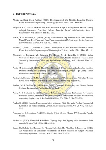 Mie merupakan produk olahan yang pada umumnya, bahan dasar pembuatan mie adalah tepung terigu. Penggunaan tepung non-terigu mulai digunakan oleh beberapa produsen mie dan semakin banyak penelitian tentang produk mie berbahan dasar non-terigu. Tujuan penelitian ini adalah untuk mengetahui faktor-faktor yang mempengaruhi preferensi konsumen terhadap produk mie berbahan dasar tepung terigu, mengetahui bagaimana sikap dan ketertarikan konsumen terhadap produk inovasi mie, dan mengetahui preferensi konsumen terhadap inovasi produk mie berbahan dasar non-terigu. Penelitian dilakukan dengan mencari literatur tentang pembuatan mie berbahan dasar non-terigu yang akan dijadikan acuan dalam memberikan penggambaran untuk survei preferensi konsumen terhadap produk mie non-terigu. Sebanyak 125 responden berusia 17 sampai 25 tahun terlibat di dalam penelitian ini. Data dianalisis dengan uji validitas dan reliabilitas untuk mengetahui data yang valid dan reliabel. Sedangkan untuk mengetahui faktor-faktor yang mempengaruhi preferensi konsumen diuji dengan Analisis Faktor dengan Kaiser-Meyer-Olkin (KMO) Measure of Adequacy dan Bartlett’s Test of Sphericity untuk menghasilkan data yang layak dilakukan analisis faktor dan dihasilkan faktor-faktor yang memengaruhi preferensi konsumen terhadap produk mie. Hasil analisis menunjukkan bahwa mie basah terigu membentuk 3 komponen baru yang menjelaskan beberapa faktor, yaitu eksternal, internal, serta harga dan rasa. Mie kering terigu juga membentuk 3 komponen baru, yaitu eksternal dan internal, sifat organoleptik, serta harga. Sedangkan mie instan terigu membentuk 2 komponen baru, yaitu kualitas produk serta internal dan eksternal. Dapat disimpulkan bahwa mie basah terigu paling dipengaruhi faktor eksternal, mie kering terigu paling dipengaruhi oleh faktor eksternal-internal, dan mie instan terigu paling dipengaruhi oleh faktor kualitas produk. Untuk inovasi mie berbahan dasar non-terigu, jenis mie kering menjadi jenis produk mie yang paling menarik perhatian responden dengan hasil variabelnya yang memiliki korelasi tinggi terhadap faktor yang terbentuk dan terdapat 2 komponen baru yang terbentuk yaitu pengembangan produk dan ketertarikan pada sifat organoleptik. Sedangkan mie basah dan mie instan hanya membentuk 1 komonen baru, yaiu pada mie basah komponen tersebut adalah ketertarikan produk inovasi, dan untuk mie instan adalah komponen varian produk baru. Sifat fisik pada mie basah dan mie instan non-terigu tidak menarik perhatian responden. Sehingga, komponen-komponen baru tersebut dapat menjelaskan faktor yang mempengaruhi preferensi konsumen terhadap produk mie, baik berbahan dasar terigu maupun inovasi mie berbahan dasar non-terigu.