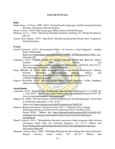 Permasalahan lingkungan telah menjadi permasalahan kompleks yang tak kunjung menemui ujungnya. Berbagai upaya telah dilakukan guna menghadapi hal tersebut namun nyatanya kerusakan lingkungan masih terus terjadi. Kompleksnya permasalahan lingkungan hari ini tidak berhenti pada perkara rusak secara fisik saja namun juga telah mengarah kepada permasalahan moral manusia yang kemudian diperlukan etika lingkungan untuk turut serta mengatasinya. Beragam jenis etika lingkungan dan yang paling terbaru lahir dari kalangan Gereja Katolik Roma pada tahun 2015 yaitu Ensiklik Laudato Si’ dengan ajakan populernya adalah tentang Pertobatan Ekologis. Pertobatan Ekologis adalah upaya perubahan sikap untuk memperlakukan lingkungan dengan tetap menyadari bahwa manusia bukanlah penguasa bumi sehingga hak-hak sesama ciptaan harus tetap diberikan, manusia boleh memanfaatkan sumberdaya alam namun tidak boleh mengeksploitasi yang berujung merusaknya. Salah satu kerusakan lingkungan yang dibahas dalam Ensiklik Laudato Si’ adalah bencana kekeringan dimana hal tersebut menjadi fenomena tahunan di Wilayah Kabupaten Wonogiri, Jawa Tengah yang oleh Paroki Santo Yusup Baturetno digunakan semangat pertobatan ekologis yang kemudian diwujudkan dengan kegiatan menanam pohon beringin yang diberi nama “Menanam Air dan Udara Segar” karena kemampuan akar pohon beringin dalam menyimpan banyak cadangan air serta rimbunnya dedaunannya yang dapat menghasilkan udara sejuk untuk mencegah terjadinya bencana kekeringan tersebut. Penelitian ini akan menganalisis Bagaimana “gerakan menanam air dan udara segar” di Paroki Santo Yusuf Baturetno, Kabupaten Wonogiri dapat dianggap sebagai wujud dari pertobatan ekologis di Laudato Si’ dengan menggunakan metode penelitian deskriptif kualitatif. Pengumpulan data dilakukan dengan cara observasi dan wawancara terhadap 15 narasumber di Kecamatan Nguntoronadi, Tirtomoyo dan Baturetno selama bulan September – Oktober tahun 2020 yang kemudian data-data tersebut dianalisis dengan metode deskriptif analitis. Berdasarkan hasil penelitian dapat dituliskan bahwa: 1). Pertobatan ekologis adalah upaya menjaga karya-karya Allah khususnya dalam hal ini adalah alam semesta yang perwujudannya dimulai dari menumbuhkan kesadaran pada diri masing-masing individu namun implementasinya dapat lebih maksimal apabila dilaksanakan secara komunal; 2). Kegiatan Menanam Air dan Udara Segar memang telah dimulai lima tahun sebelum lahirnya ensiklik laudato si’ akan tetapi semangat pertobatan ekologis yaitu semangat menjaga karya Allah telah menjadi landasan dalam pelaksanaan kegiatan tersebut; 3). Sebelum lahirnya Ensiklik Laudato Si’, Kegiatan Menanam Air dan Udara Segar semata masih banyak terfokus pada penanaman dan pengelolaan namun setelah lahirnya Ensiklik Laudato Si’, kegiatan tersebut telah melangkah lebih jauh menjadi percontohan untuk wilayah-wilayah yang lain; 4). Kegiatan yang melibatkan masyarakat non-Katholik ini meskipun sempat disalahpahami oleh sebagian kecil masyarakat tetapi pada akhirnya justeru didukung oleh masyarakat sekitar karena kegiatan ini memang benar-benar bertujuan untuk melestarikan lingkungan yaitu mencegah bencana kekeringan. Dengan demikian dapat dikatakan bahwa “Kegiatan Menanam Air dan Udara Segar” pada mulanya memang tidak menggunakan Ensiklik Laudato Si’ sebagai acuan namun viii semangat pertobatan ekologis yakni semangat menjaga karya Allah telah diimplementasikan dalam kegiatan tersebut.