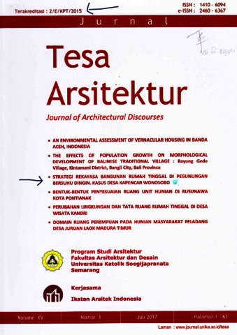 REJEKI, VG. SRI (2017) Strategi Rekayasa Bangunan Rumah Tinggal di Pegunungan Bersuhu Dingin Kasus Desa Kapencar Wonosobo. TESA Arsitektur, 15 (1). pp. 26-30. ISSN 1410-6094