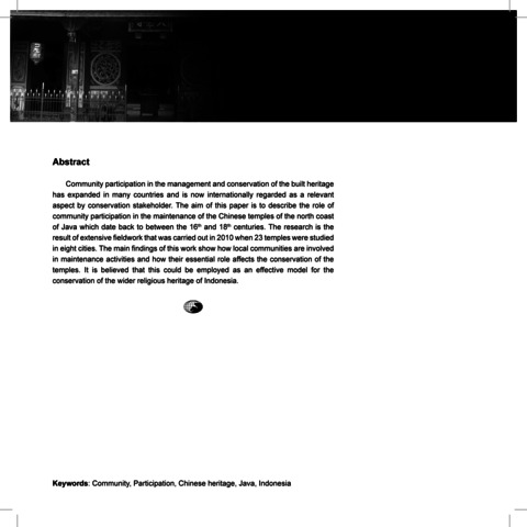 Community Participation in the management and conservation of the built heritage has expanded in many countries and is now internationally regarded as a relevany aspect by conservation stakeholder. The aim of this paper is to describe the role of community participation in the maintenance of the Chinese temples of the north coast of Java which date back to the 16th and 18th centuries. The reserach is the result of extensive fieldworks that was carried out in 2010 when 23 temples were studies in eight cities. The main findings of thie work show how local communities are involved in maintenance activities and how their essential role affects the conservation of the temples. It is believed that this could be employed as an effective model for the conservation of the wider religious heritage in Indonesia Keywords: COmmunity, participation, Chinese heritage, Java, Indonesia