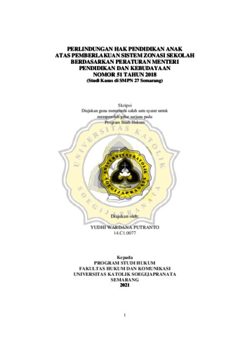 PUTRANTO, YUDHI WARDANA (2021) PERLINDUNGAN HAK PENDIDIKAN ANAK ATAS PEMBERLAKUAN SISTEM ZONASI SEKOLAH BERDASARKAN PERATURAN MENTERI PENDIDIKAN DAN KEBUDAYAAN NOMOR 51 TAHUN 2018 (Studi Kasus di SMPN 27 Semarang). Other thesis, Universitas Katholik Soegijapranata Semarang.