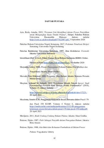 Skripsi dengan judul “Pengumpulan Alat Bukti dan Barang Bukti dalam Proses Penyidikan oleh Satreskrim Polrestabes Semarang dalam Mengungkap Tindak Pidana Pembunuhan (Studi Kasus Pembunuhan di Ngaliyan Kota Semarang)” ini bertujuan: (1) untuk mengetahui bagaimana proses penyidikan dalam kasus tindak pidana pembunuhan yang ditangani oleh Satreskrim Polrestabes Semarang, (2) untuk mengetahui bagaimana proses pengumpulan alat bukti dan barang bukti selama proses penyidikan dalam kasus tindak pidana pembunuhan yang ditangani oleh Satreskrim Polrestabes Semarang dan (3) mengetahui hambatan yang dihadapi selama proses penyidikan berlangsung. Metode penelitian yang digunakan dalam penelitian ini adalah metode pendekatan kualitatif. Sumber data yang diperoleh dari hasil pencarian data di lapangan melalui teknik wawancara dengan narasumber dan studi pustaka. Hasil penelitian ini menunjukan bahwa mengenai tindak pidana pembunuhan diperoleh barang bukti yang menjadi pendukung dari alat bukti sehingga memenuhi unsur perbuatan tersebut yang kemudian dilaksanakan proses penyidikan. Aparat penegak hukum seperti Satreskrim Polrestabes Semarang sebagai eksekutor melakukan kegiatan penyidikan setelah mendapatkan laporan kepolisian. Pasal 184 ayat 1 Kitab Undang-Undang Hukum Pidana mengatur mengenai apabila suatu perkara menjadi sah jika terdapat minimal 2 alat bukti. Pencarian alat bukti, penetapan tersangka dan penyidikan dilakukan oleh pihak kepolisian yang mempunyai kewenangan, apabila berkas perkara penyidikan sudah lengkap maka berkas perkara dilimpahkan kepada Pengadilan untuk penetapan hukuman kepada tersangka. Kesimpulan skripsi ini adalah untuk menerangkan bagaimana pengumpulan alat bukti dan barang bukti dalam proses penyidikan tindak pidana pembunuhan yang ditangani Satreskrim Polrestabes Semarang untuk membuktikan bersalahnya seorang tersangka dan juga sebagai jalan bagi pengadilan dalam menentukan putusan pidana bagi tersangka demi mewujudkan keadilan kepada korban.