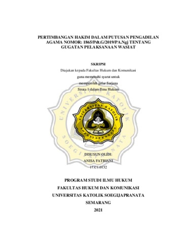 FATRIANI, ANISA (2021) PERTIMBANGAN HAKIM DALAM PUTUSAN PENGADILAN AGAMA NOMOR: 1865/Pdt.G/2019/PA.Ngj TENTANG GUGATAN PELAKSANAAN WASIAT. Other thesis, Universitas Katholik Soegijapranata Semarang.