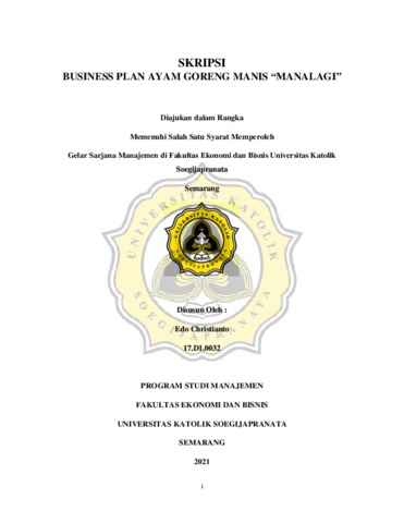 Christianto, Edo (2021) BUSINESS PLAN AYAM GORENG MANIS “MANALAGI”. Other thesis, Universitas Katholik Soegijapranata Semarang.