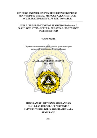 EVELYNE, ANASTASIA YOLANDA (2021) PENDUGAAN UMUR SIMPAN BUBUK PENYEDAP RASA SEAWEED Ulva lactuca L. MENGGUNAKAN METODE ACCELERATED SHELF LIFE TESTING (ASLT). Other thesis, Universitas Katholik Soegijapranata Semarang.