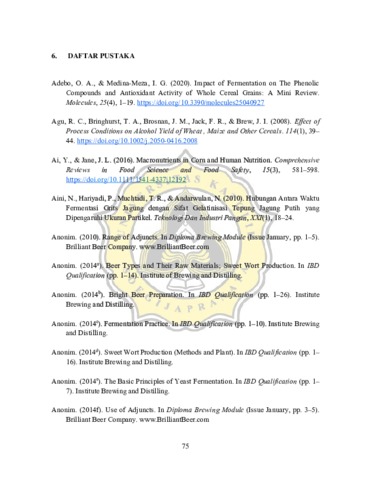 SUKOTJO, KATARINA AYU KRISNAWATI (2021) PENGARUH PENAMBAHAN GRITS JAGUNG (Zea mays L.) SEBAGAI ADJUNCTS DAN EXTRACT MALT BARLEY TERHADAP KARAKTERISTIK FISIKOKIMIAWI, MIKROBIOLOGI DAN SENSORI PRODUK BIR. Other thesis, Universitas Katholik Soegijapranata Semarang.