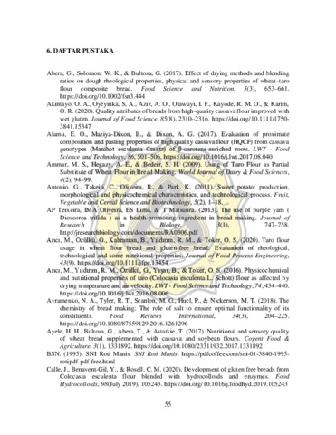 Roti merupakan salah satu produk pangan yang banyak digemari oleh masyarakat karena roti tergolong makanan yang praktis untuk dibawa kemana saja dan tidak memerlukan banyak tahap untuk pengolahannya. Umumnya roti dibuat dengan menggunakan tepung terigu sebagai bahan dasarnya dan salah satu komponen yang terkandung di dalam tepung terigu adalah gliadin dan glutenin yang akan membentuk protein gluten dalam proses pencampuran. Berbagai penelitian menyatakan bahwa protein gluten merupakan komponen dalam tepung terigu yang dapat menyebabkan alergi pada beberapa konsumen. Intoleransi terhadap gluten ini berdampak cukup serius pada usus halus dan biasanya disebut dengan celiac disease. Berbagai penelitian telah dilakukan untuk menghadirkan produk roti yang bebas gluten sehingga aman untuk dikonsumsi semua orang. Penelitian ini bertujuan untuk mengetahui manfaat konsumsi produk bebas gluten oleh penderita celiac disease dilihat dari nutrisi yang diperoleh dan dampaknya terhadap kesehatan penderita, mengetahui pengaruh penggunaan tepung ubi ungu, talas, dan singkong terhadap karakteristik fisik adonan dan hasil akhir roti tawar, serta membandingkan karakteristik fisik dan nilai nutrisi roti tawar yang dibuat dengan tepung ubi ungu, talas, dan singkong untuk mendapat bahan terbaik dalam pembuatan roti bebas gluten. Berdasarkan berbagai penelitian, tepung dari umbi-umbian terbukti dapat digunakan sebagai pengganti terigu sebagai bahan bebas gluten untuk pembuatan roti tawar bebas gluten. Tepung dari umbi-umbian memiliki berbagai kandungan nutrisi yang cukup lengkap diantaranya adalah serat pangan, karbohidrat, protein, mineral, dan vitamin sehingga terbukti dapat meningkatkan nutrisi pada produk roti dan memenuhi kekurangan nutrisi yang dialami penderita celiac disease. Penggunaan tepung umbi-umbian dengan persentase yang semakin tinggi dapat menurunkan nilai volume spesifik pada roti tawar karena tidak adanya kandungan gluten di dalamnya yang berperan pada proses pengembangan. Pigmen warna antosianin yang terdapat dalam ubi ungu juga mempengaruhi hasil warna dari produk roti tawar menjadi lebih gelap. Penambahan tepung bebas gluten yang lain atau berbagai enzim dapat menjadi alternatif untuk meningkatkan hasil akhir produk roti tawar bebas gluten.