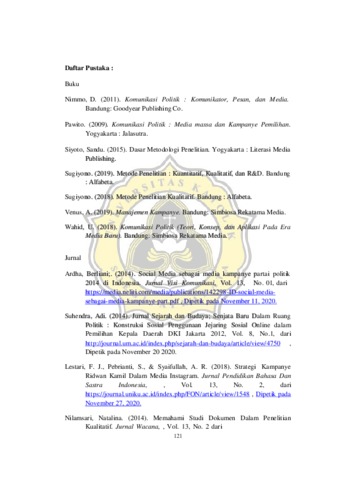 Setianingrum, Cornelia Agata Wiji (2021) PESAN KAMPANYE DI MEDIA SOSIAL INSTAGRAM DAN FACEBOOK PASANGAN CALON TUNGGAL DALAM PEMILIHAN KEPALA DAERAH SERENTAK 2020 PADA 25 KABUPATEN/KOTA. Other thesis, Universitas Katholik Soegijapranata Semarang.
