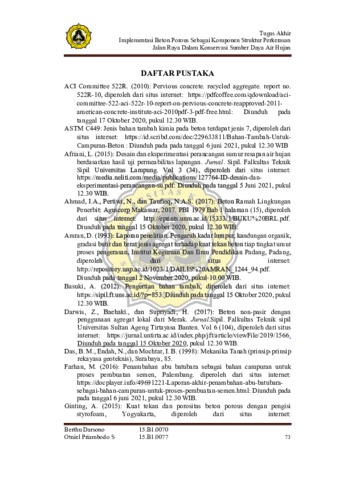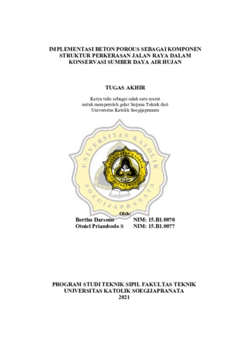 Darsono, Berthu and Priambodo S, Otniel (2021) IMPLEMENTASI BETON POROUS SEBAGAI KOMPONEN STRUKTUR PERKERASAN JALAN RAYA DALAM KONSERVASI SUMBER DAYA AIR HUJAN. Other thesis, Unika Soegijapranata Semarang.