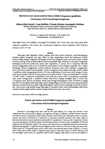Makroalga telah digunakan industri pangan sejak lama karena komponen yang dikandungnya misalnya alginat, karagenan, dan agar. Selain itu alga mengandung nutrisi dan komponen bioaktif lainnya sebagai pangan fungsional. Kandungan protein dan keragaman jenis asam amino dapat menjadi informasi penting untuk memaksimalkan potensi yang dimiliki alga. Penelitian ini bertujuan mengetahui kandungan protein dan profil asam amino pada S.aquifolium, U. lactuca, dan G. longissima. Ekstraksi protein menggunakan pelarut 0,4 M NaOH dan ultrasonikasi 5 menit dengan amplitudo 70%. Analisis kandungan protein menggunakan metode Bradford. Komposisi asam amino dianalisis menggunakan ultra performance liquid chromatography. Protein tertinggi di antara ketiga makroalga tersebut adalah S. aquifolium yakni mengandung protein 4,17% dan teridentifikasi 16 jenis asam amino dengan 10 jenis asam amino esensial (AAE) dan 6 asam amino non esensial (AANE). U lactuca teridentifikasi 9 AAE dan 6 AANE. Untuk G. longissima teridentifikasi 8 jenis AAE dan 6 jenis AANE. Asam glutamat merupakan asam amino tertinggi pada S. aquifolium sebesar 400,27±62,27 mg/kg, sedangkan pada U. lactuca dan G. longissima asam aspartat merupakan AANE yang tertinggi kandungannya yakni 274,60±50,14 mg/kg dan 435,57±25,81mg/kg. Edible makroalga tersebut mengandung protein dan asam amino yang penting dan beberapa memiliki konsentrasi lebih tinggi dibandingkan sumber protein makroalga sejenis dari perairan lain. Asam amino yang dimiliki ketiga makroalga ini memiliki potensi untuk dikembangkan lebih lanjut menjadi produk pangan berbasis tanaman dengan karakter flavor dan rasa umami.