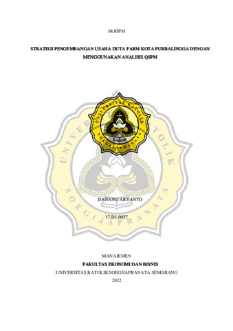 ARYANTO, DANANG (2022) STRATEGI PENGEMBANGAN USAHA DUTA FARM KOTA PURBALINGGA DENGAN MENGGUNAKAN ANALISIS QSPM. Other thesis, Universitas Katolik Soegijapranata.