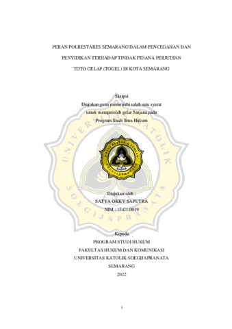 SAPUTRA, SATYA OKKY (2022) PERAN POLRESTABES SEMARANG DALAM PENCEGAHAN DAN PENYIDIKAN TERHADAP TINDAK PIDANA PERJUDIAN TOTO GELAP (TOGEL) DI KOTA SEMARANG. S1 thesis, Universitas Katholik Soegijapranata Semarang.