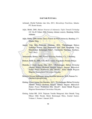 Penelitian ini dilatarbelakangi peristiwa hukum di mana notaris sering menjadi pihak tergugat di pengadilan. Oleh karena itu, penelitian berjudul Perlindungan Hukum Terhadap Notaris Dalam Pembuatan Akta yang Diduga Berdasarkan Keterangan Palsu (Studi Kasus Putusan Nomor: 398/Pdt.G/2014/PN.Smg) dilakukan untuk mengetahui gugatan penggugat yang berdasarkan dugaan keterangan palsu terhadap notaris. Perumusan masalah penelitian ini adalah: a) Atas dasar apakah dugaan keterangan palsu diajukan oleh penggugat?, b) Bagaimana upaya yang ditempuh Notaris untuk menghindari adanya dugaan keterangan palsu? Dan c) Bagaimana perlindungan hukum bagi Notaris dalam pembuatan akta yang diduga berdasarkan keterangan palsu? Penelitian ini menggunakan metode pendekatan yuridis empiris guna mengkaji ketentuan hukum yang berlaku serta apa kenyataan yang terjadi di masyarakat. Data yang digunakan adalah data primer yang diperoleh melalui wawancara yang terarah terhadap notaris, MPD, MKNW, INI. Data sekunder yang digunakan untuk mendukung data primer diperoleh melalui studi kepustakaan. Analisis data yang digunakan dalam penelitian ini adalah deskriptif kualitatif. Hasil penelitian yang diperoleh menunjukkan bahwa notaris mengalami gugatan atas dugaan mencantumkan keterangan palsu pada akta yang dibuatnya atau tidak melakukan tugas sebagaimana yang sudah ditentukan oleh UU Jabatan Notaris. Upaya yang ditempuh oleh notaris agar terhindar dari dugaan keterangan palsu adalah dengan berpegang teguh pada ketentuan dan peraturan yang ada, terutama UUJN dan Kode Etik Notaris saat melaksanakan profesinya, selain itu untuk mengecek keaslian akta dapat dilakukan dengan cara menggunakan teknologi yang ada, seperti: barcode, hologram dan pengecekan keaslian kartu tanda penduduk menggunakan teknologi NFC. Hasil penelitian juga menunjukkan bahwa perlindungan hukum terhadap notaris sudah diatur di dalam UU Jabatan Notaris yang berupa tugas dan kewenangan yang harus dikerjakan, larangan yang harus dipatuhi oleh notaris, sedangkan tugas dan kewenangan Majelis Pengawas Daerah (MPD) dalam memberikan perlindungan hukum adalah dengan mereview ulang perkara yang menimpa Notaris dan setelahnya terbatas memberikan pendampingan moril. Kesimpulan yang diperoleh adalah bahwa dugaan keterangan palsu yang menjadi materi gugatan adalah: notaris dianggap tidak melaksanakan kewajibannya karena tidak menanyakan hak bagian Penggugat, notaris dianggap memasukan keterangan yang palsu ke dalam akta, notaris dianggap mengetahui terjadinya peralihan hak obyek sengketa, dan anggapan bahwa perjanjian kredit yang dibuat berdasarkan kondisi yang tidak sesuai atau keadaan palsu. Oleh karena itu, saran yang diajukan adalah: Notaris sebagai pejabat umum dalam membuat akta otentik harus selalu memperhatikan standar atau syarat-syarat dari suatu akta otentik, baik dari UUJN mapun Kode Etik.