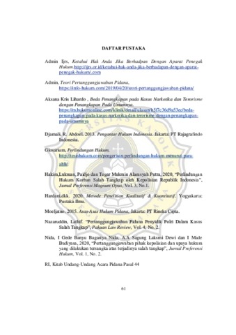 Penulisan hukum dengan judul “Pertanggungjawaban Kepolisian Saat Melakukan Kesalahan Prosedur Penangkapan (Studi Kasus Dugaan Kesalahan Prosedur Penangkapan Yang Di Tangani Oleh Propam Polda Jawa Tengah)” yang bertujuan untuk mengetahui apa saja bentuk kesalahan prosedur penangkapan dan kosekuensi yang diberikan kepada anggota kepolisian jika didapati terjadinya kesalahan prosedur penangkapan. Penelitian ini menggunakan pendekatan kualitatif. Data yang diperoleh menggunakan studi kepustakaan dan wawancara dengan anggota Propam Polda Jawa Tengah atau Kaurstandardisasi subbidwabrof bidpropam Polda Jawa Tengah. Data tersebut lalu dianalisis secara kualitatif. Hasil dari penelitian ini adalah (1) banyak sekali macam-macam kesalahan dalam prosedur penangkapan. Hal ini terjadi karena adanya kurang komunikasi antar anggota kepolisian. Karena pada dasarnya saat melakukan penangkapan, komunikasi antar anggota atau tim sangat dibutuhkan. Untuk menghindari adanya kesalahan prosedur penangkapan maka anggota kepolisian diawasi langsung oleh wassidik atau pengawas penyidik. Yang mana pada saat anggota kepolisian kerja di lapangan untuk melakukan penangkapan, maka diawasilah oleh wassidik. (2) kosekuensi yang diberikan kepada anggota kepolisian yang melanggar ialah adanya Mutasi atau pemindahan penugasan dan PTDH. PTDH atau yang biasa disebut dengan Pemberhentian Dengan Tidak Hormat merupakan suatu kosekuensi jalur terakhir dengan adanya banyak pertimbangan. Hal tersebut biasanya diputuskan pada sidang KKEP. Dalam melakukan kesalahan penangkapan atau kesalahan prosedur penangkapan, terduga pelanggar tidak akan diberi kesempatan untuk berdamai pada sidang KKEP, yang mana sidang dan hukuman harus tetap berjalan sebagaimana yang diatur pada Peraturan Kepala Kepolisian Negara Republik Indonesia Nomor 14 Tahun 2011 Tentang Kode Etik Profesi Kepolisian Negara Republik Indonesia dan Peraturan Kepala Kepolisian Negara Republik Indonesia Nomor 19 Tahun 2012 Tentang Susunan Organisasi dan Tata Kerja Komisi Kode Etik Kepolisian Negara Indonesia. Kesimpulan dari penelitian ini adalah Propam Polda Jawa Tengah berperan sebagai bidang yang memberi kosekuensi kepada anggota kepolisian yang melanggar atau melakukan suatu pelanggaran yang menyebabkan kerugian yang dialami oleh anggota kepolisian, instansi bahkan masyarakat luas.