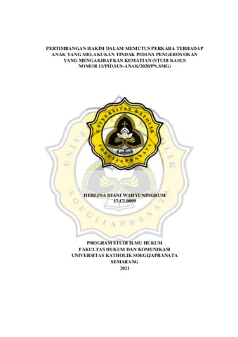 WAHYUNINGRUM, HERLINA DIANI (2022) PERTIMBANGAN HAKIM DALAM MEMUTUS PERKARA TERHADAP ANAK YANG MELAKUKAN TINDAK PIDANA PENGEROYOKAN YANG MENGAKIBATKAN KEMATIAN (STUDI KASUS NOMOR 11/PID.SUS-ANAK/2020/PN.SMG). S1 thesis, Universitas Katholik Soegijapranata Semarang.