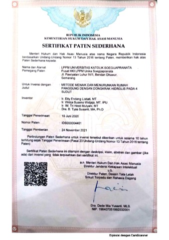 Ir. Etty Endang Listiati, MT, Ir Widija Suseno Widjaja, MT, IPU, Ir.IM Tri Hesti Mulyani, MT, Dra.B.Tyas Susanti, MA.PhD (2021) Metode Menaikkan Lantai Rumah Panggung Dengan DOngkrak Hidrolis Pada 4 Titik Kolom. IDS000004401.