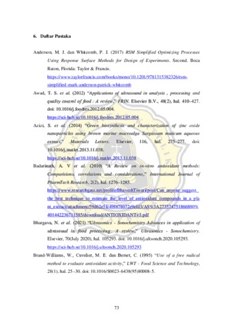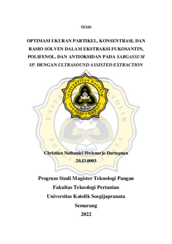 Dartagnan, Christian Nathaniel Hwienarjo (2022) OPTIMASI UKURAN PARTIKEL, KONSENTRASI, DAN RASIO SOLVEN DALAM EKSTRAKSI FUKOSANTIN, POLIFENOL, DAN ANTIOKSIDAN PADA SARGASSUM SP. DENGAN ULTRASOUND ASSISTED EXTRACTION. Masters thesis, Universitas Katholik Soegijapranata Semarang.